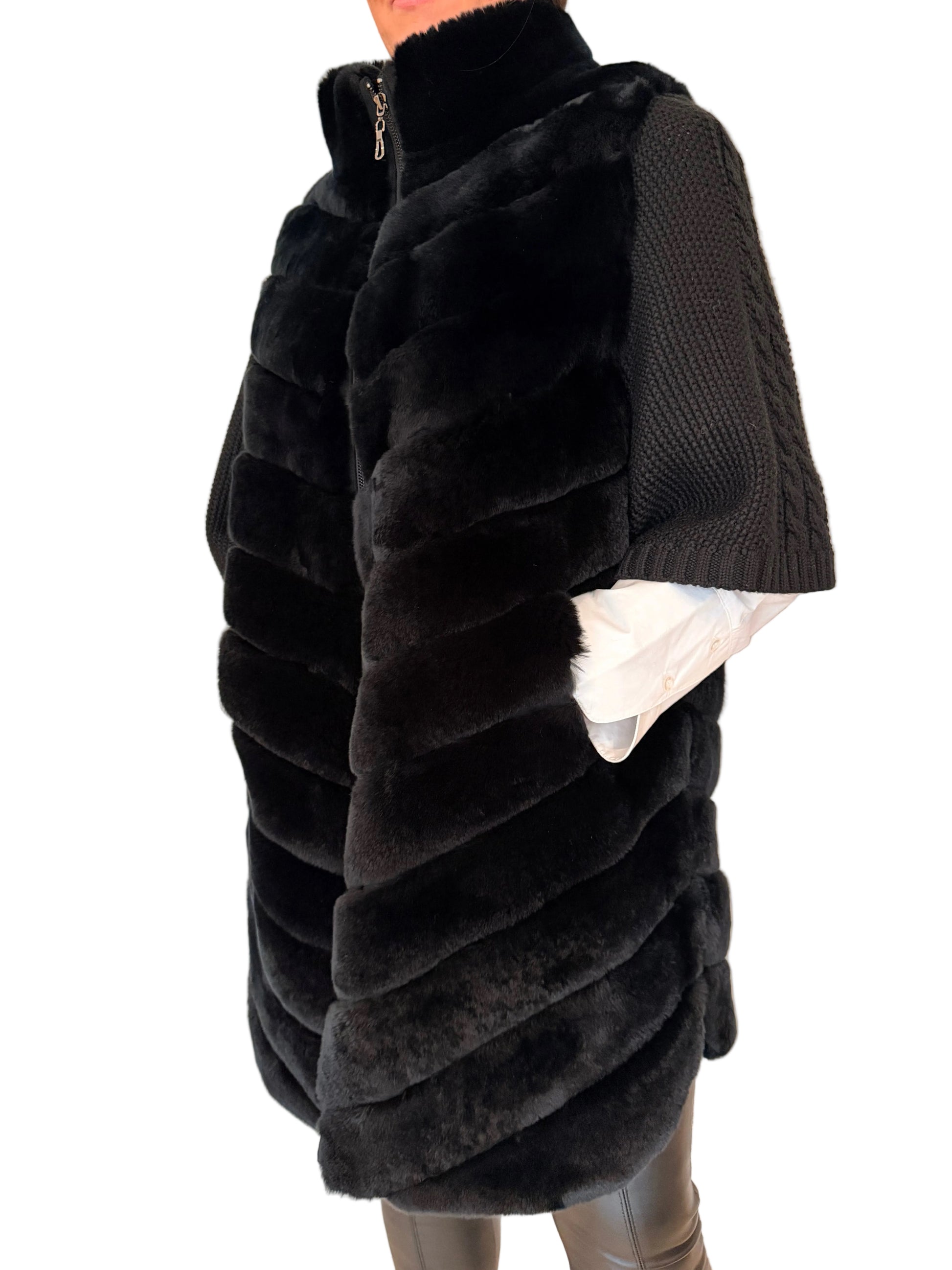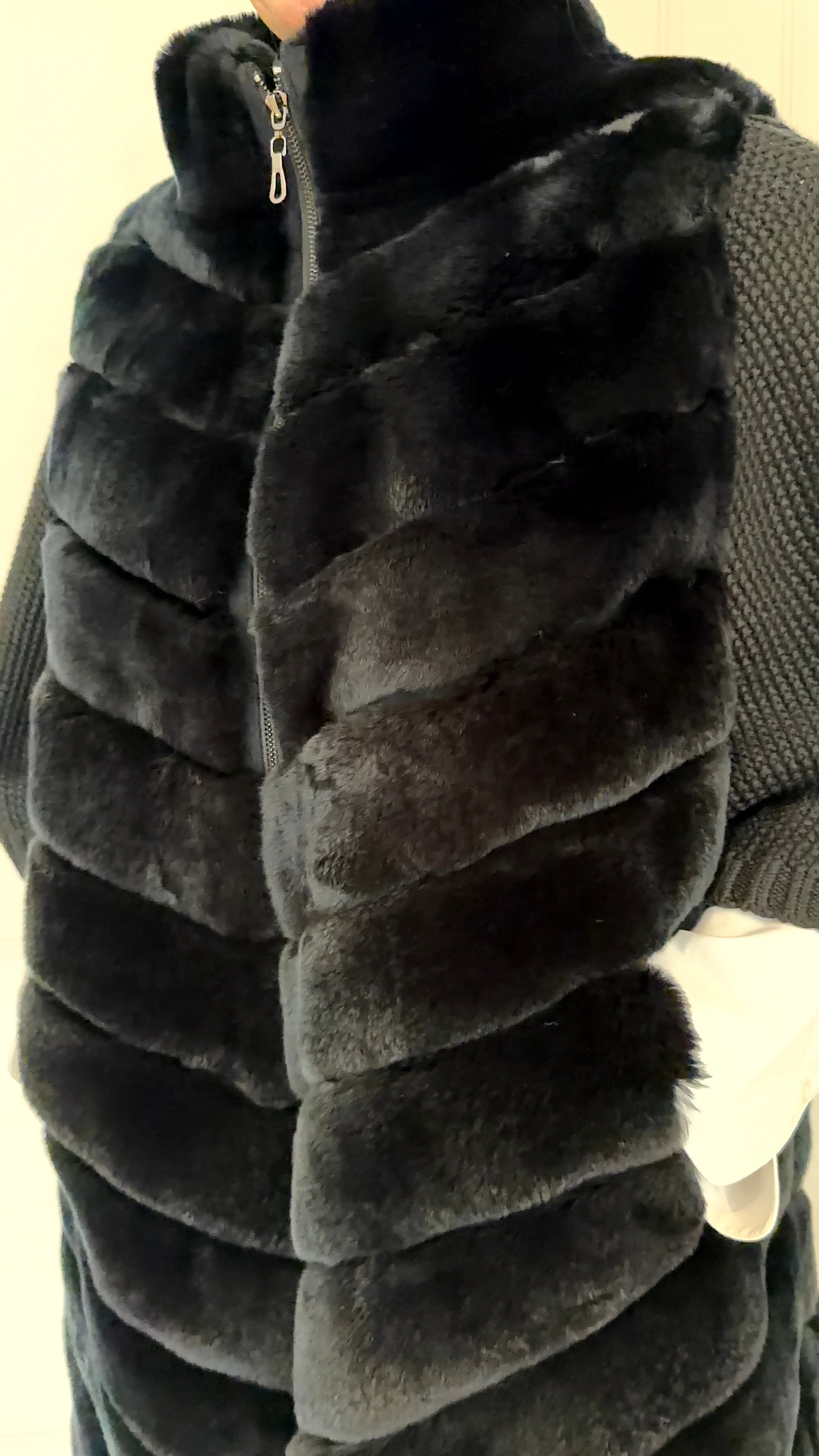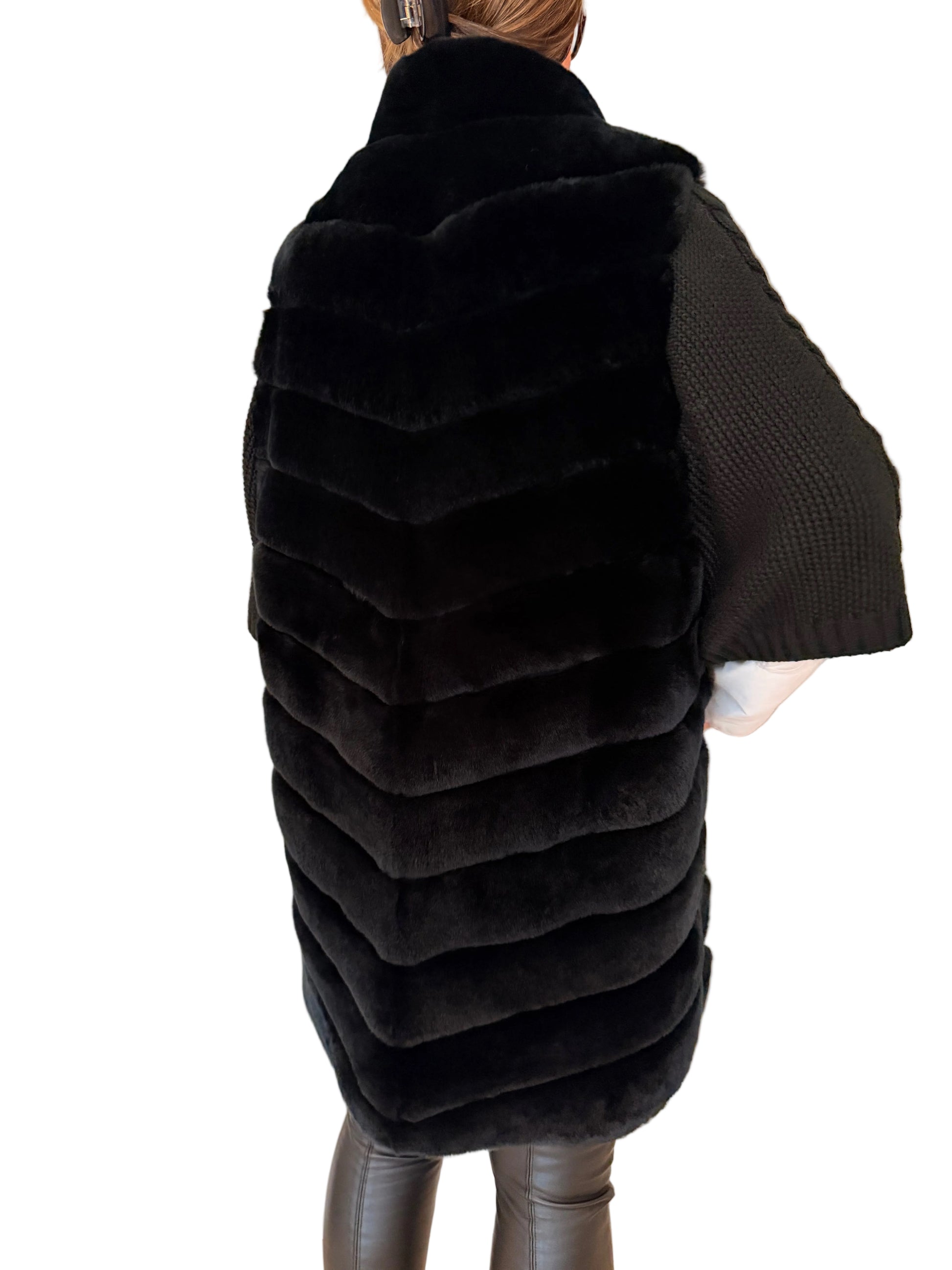 - Material: 100% real Rex rabbit fur (body), knit fabric (sleeves)